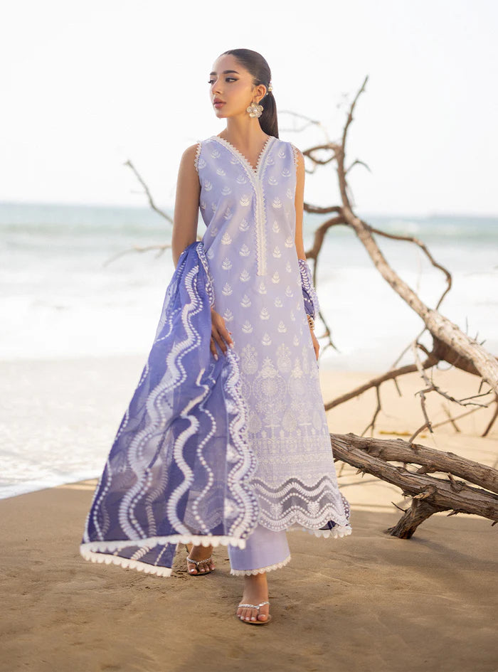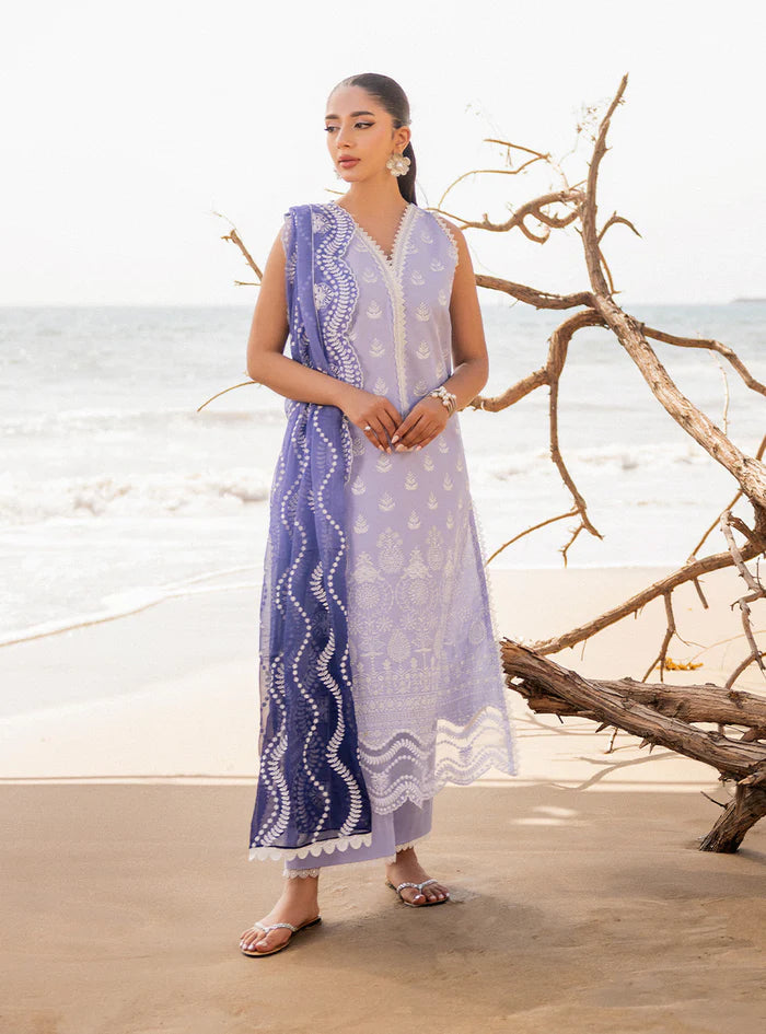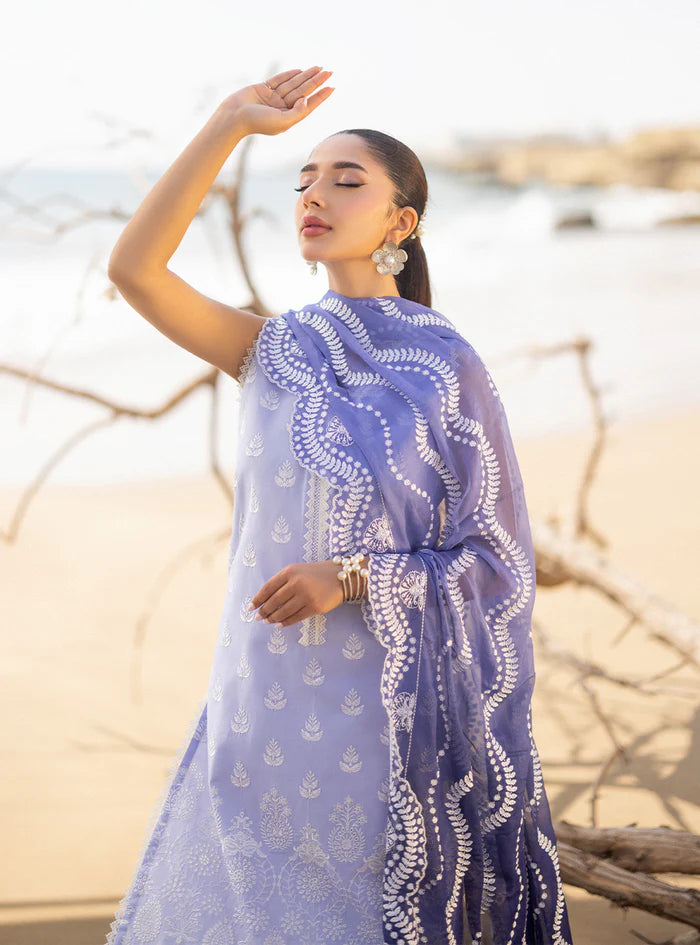 The soft lilac fabric exudes a sense of tranquility and femininity, serving as the perfect backdrop for the exquisite chikan kari embroidery. Enhancing the charm of the outfit are the embroidered white daman border and sleeves border on organza. Completing the look is the embroidered digital printed dupatta on chiffon, adding a modern twist to the traditional outfit.