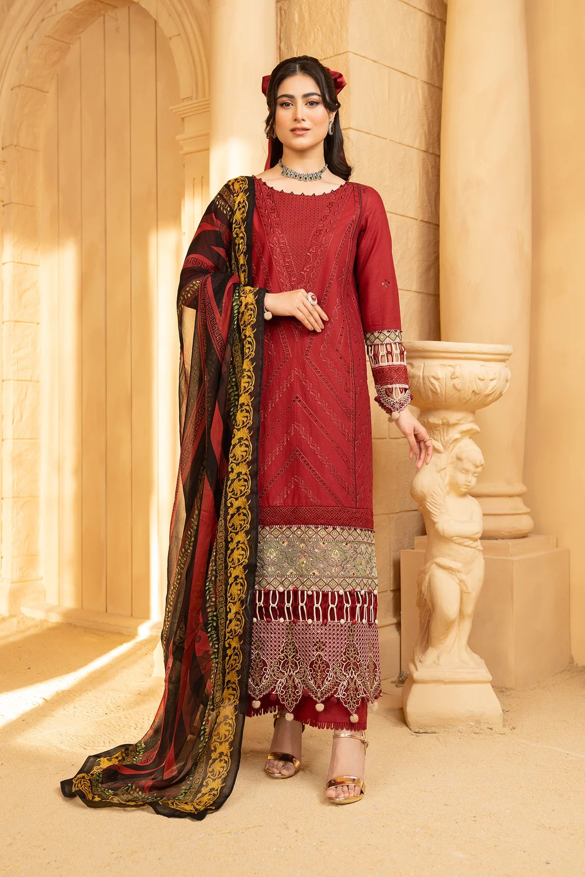 Dress to impress in our vibrant red unstitched suit, adorned with exquisite embroidery. Paired with a matching plain trouser and a printed chiffon dupatta, this ensemble is a testament to elegance and sophistication. Elevate your style with this timeless masterpiece, perfect for any special occasion!
