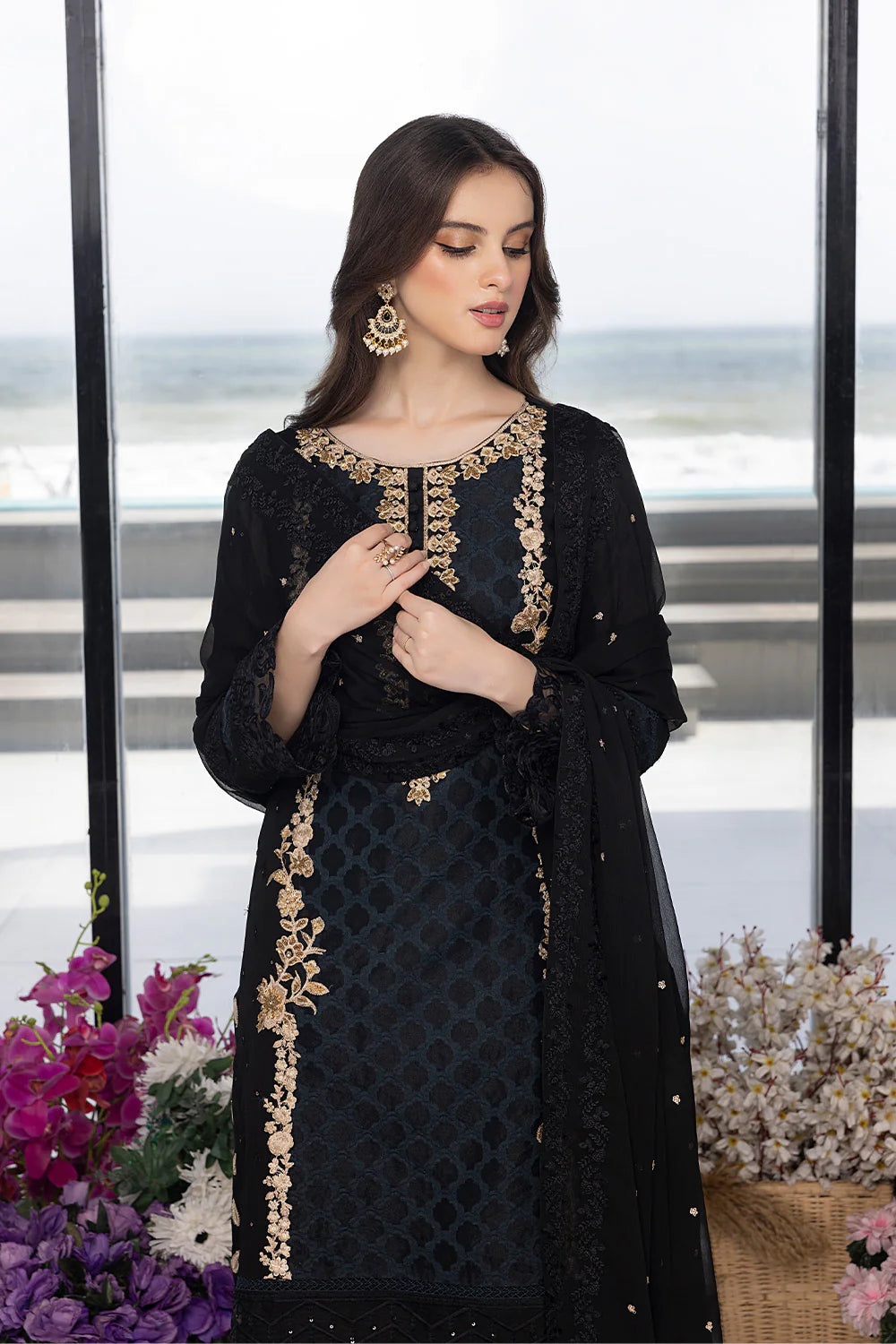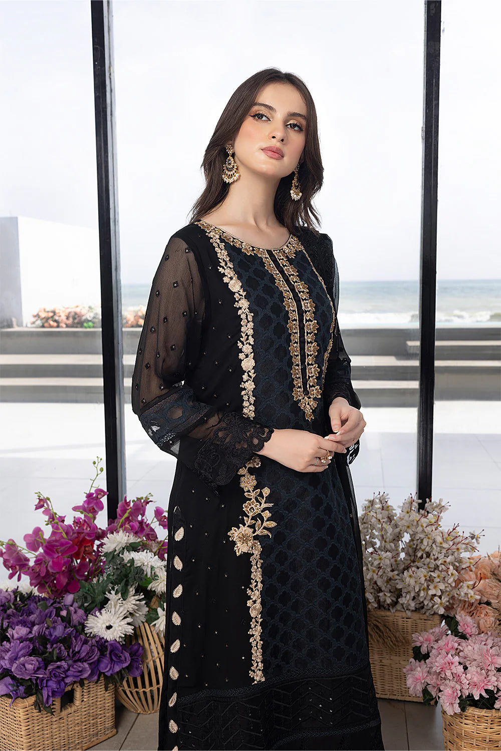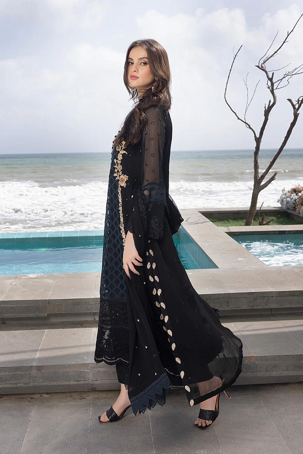 This mesmerising chiffon ensemble, rendered in a glamorous deep black tone enriched with intricate hand-embellished details, makes this set the perfect choice for a special occasion. Light up any event with this graceful three-piece set!