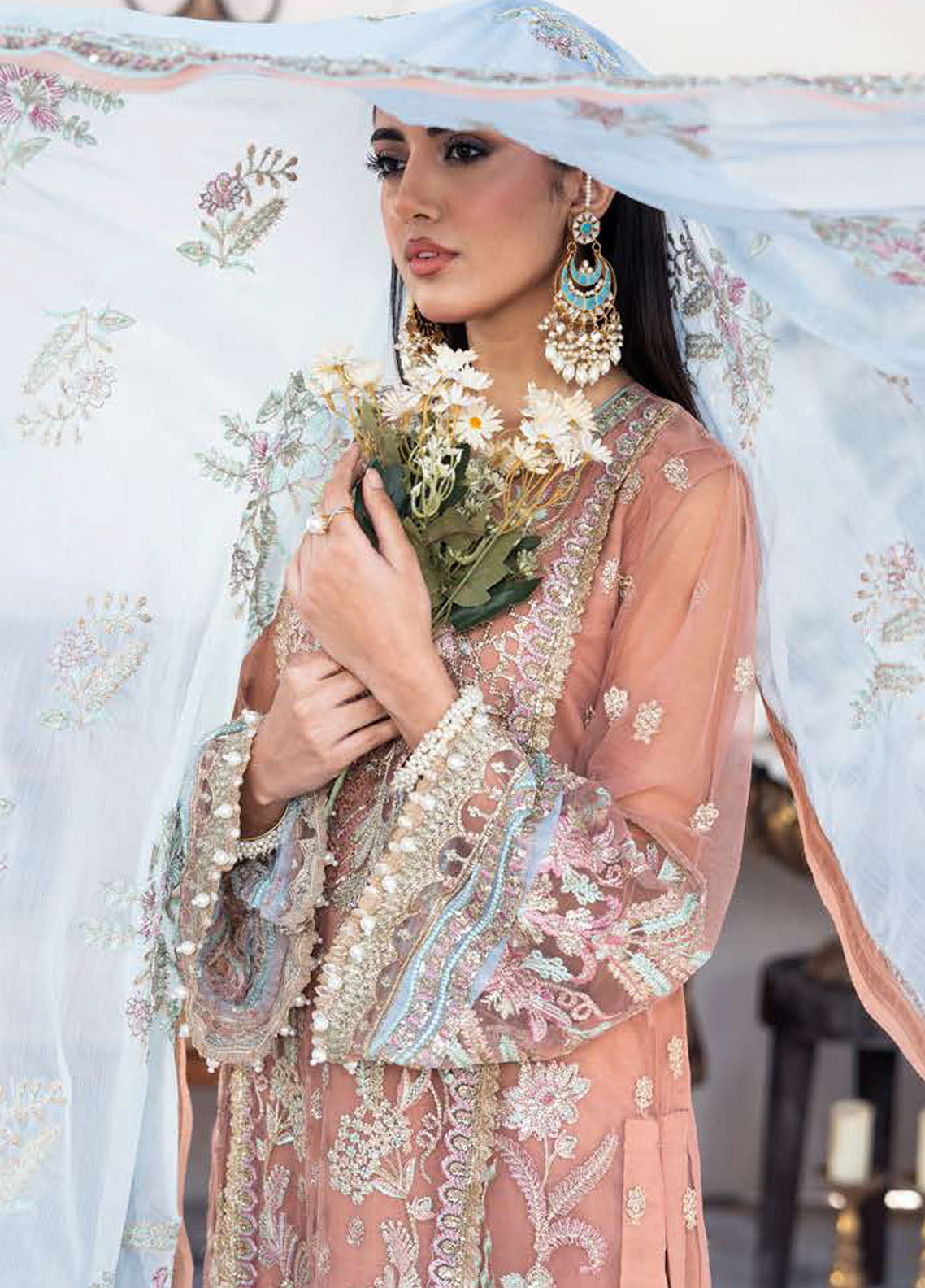 Immersed in a mesmerizing combination of peach and powder blue, ‘Hayaat’ brings life to a canvas of contemporary embroidered motifs, finished with graceful details of pearl work. The article reflects fine taste and elegance for its traditional cuts – a straight shirt and flared lehnga – along with chiffon duppata bedecked with luxurious thread, sequence and tilla work