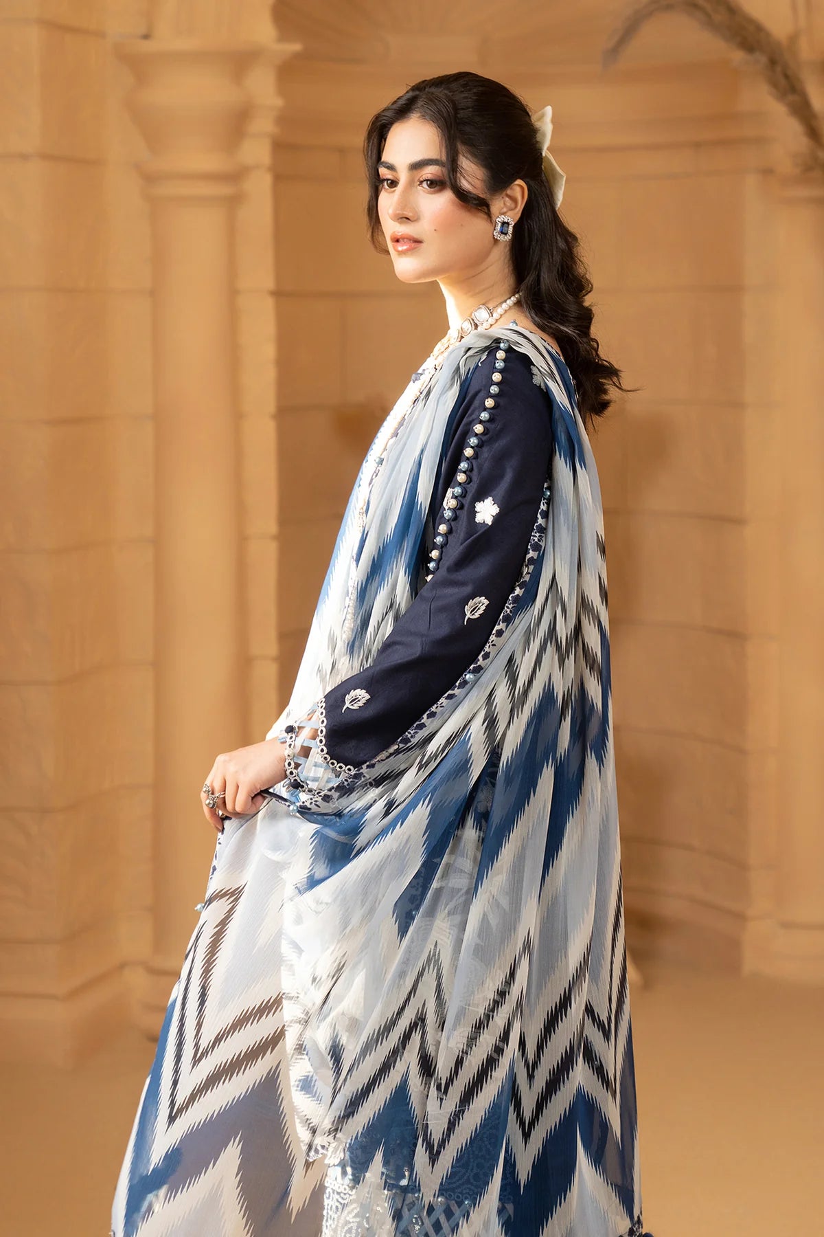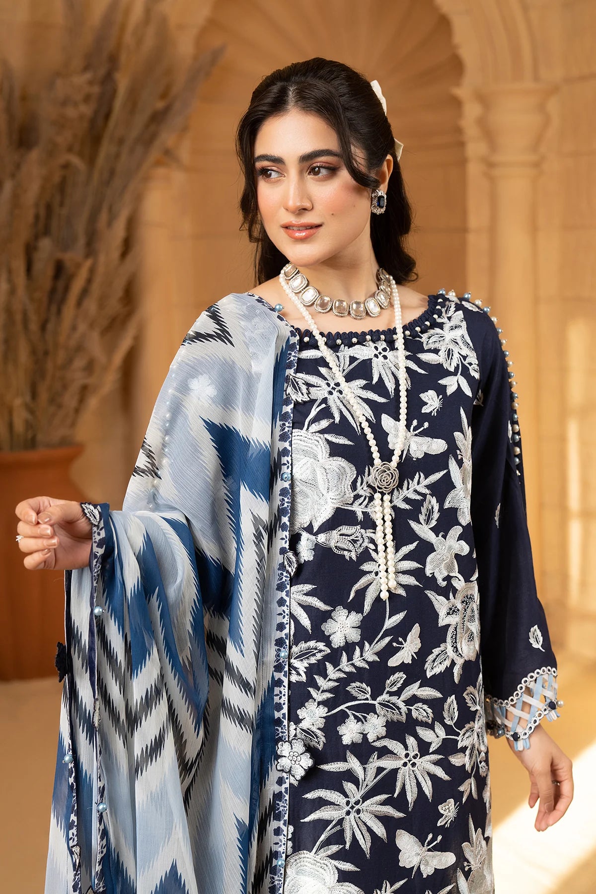Indulge in elegance with our ice blue embroidered unstitched suit, featuring intricate detailing and a matching plain trouser for a refined look. Complete your ensemble with a delicately printed chiffon dupatta, adding a touch of sophistication to your attire