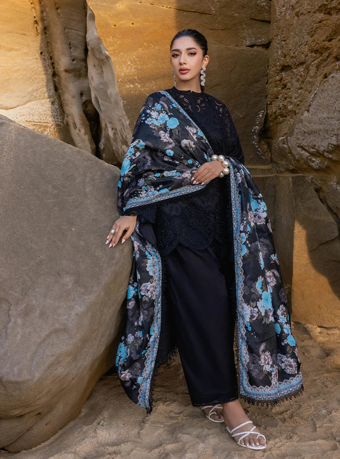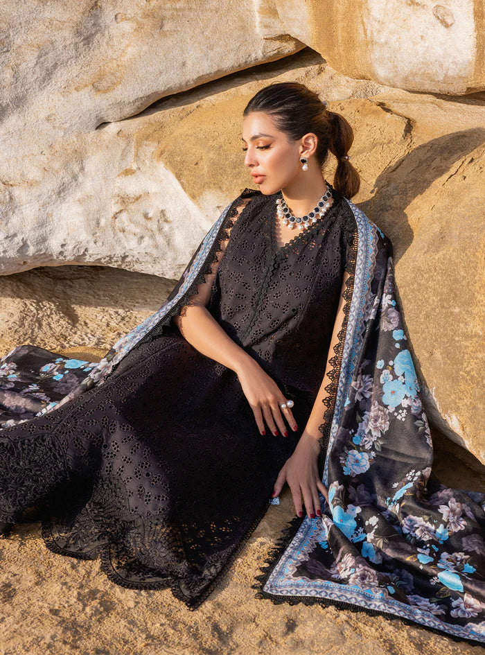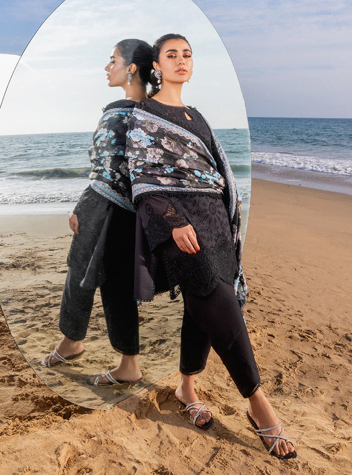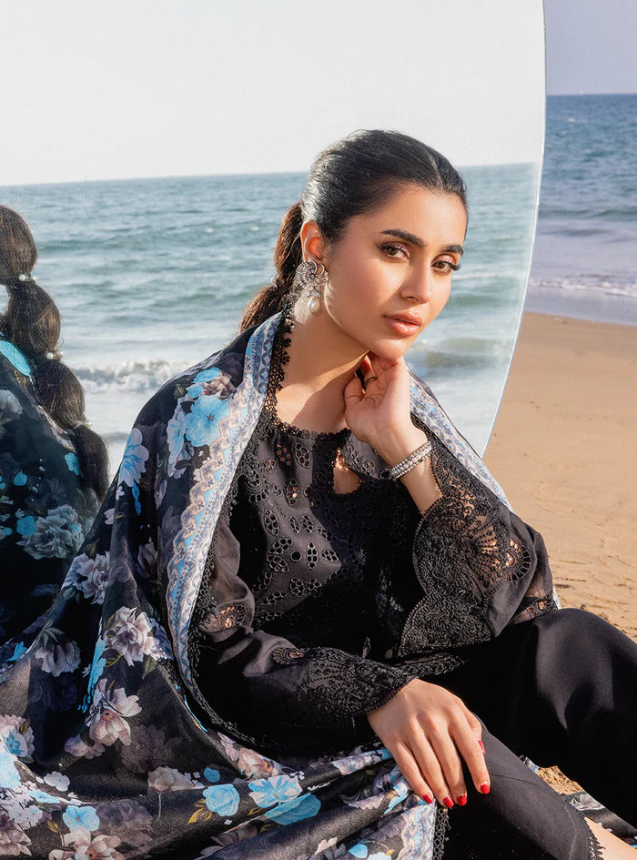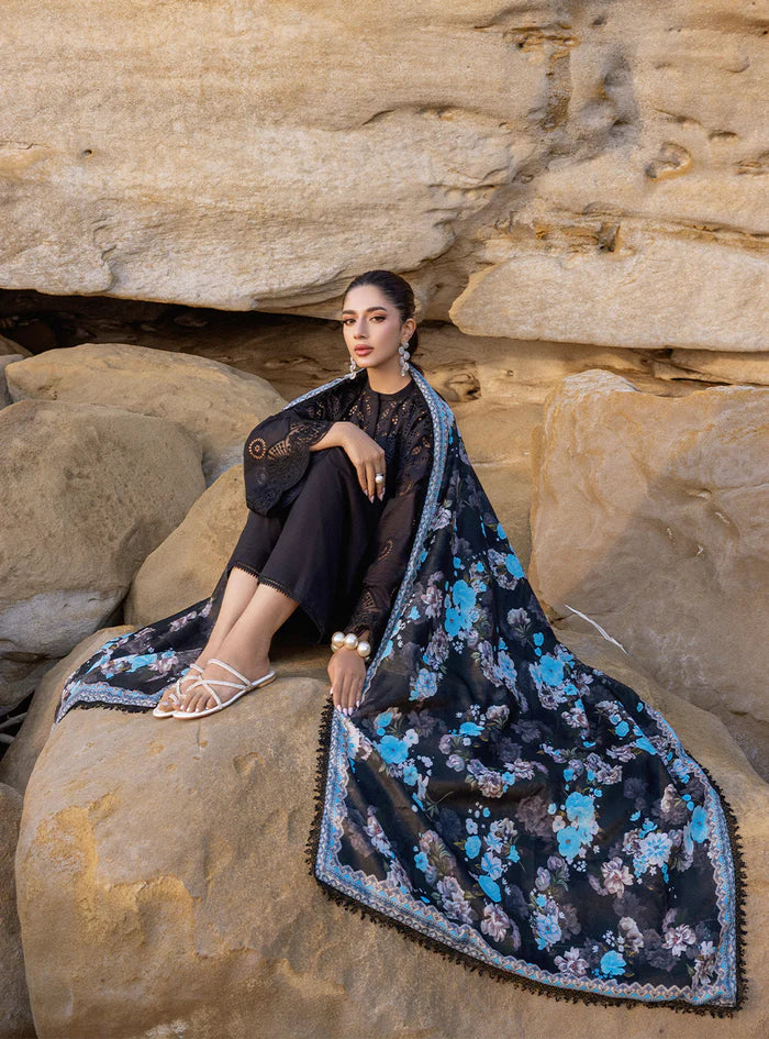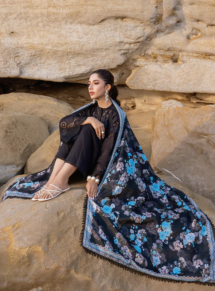 Black symbolizes sophistication, mystery, and refinement, making it a popular choice for traditional attire, particularly for evening or formal occasions. The embroidered border adds a touch of elegance and sophistication to the outfit, enhancing its overall visual appeal and providing a complete look on the black base. The set includes a net dupatta adorned with digital prints featuring soft pastel-colored floral designs.
