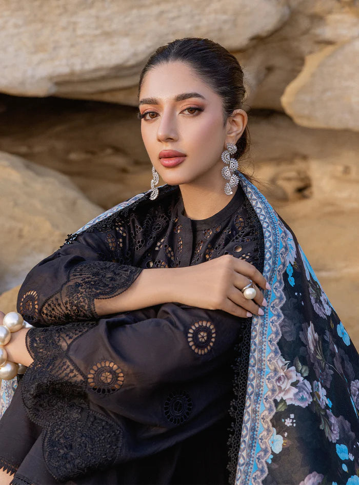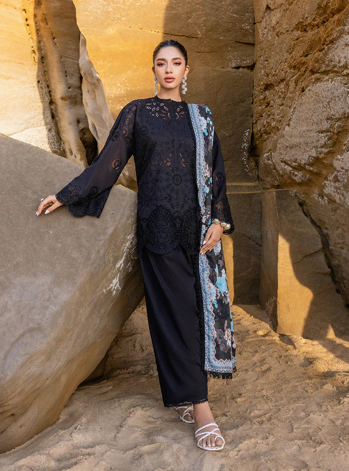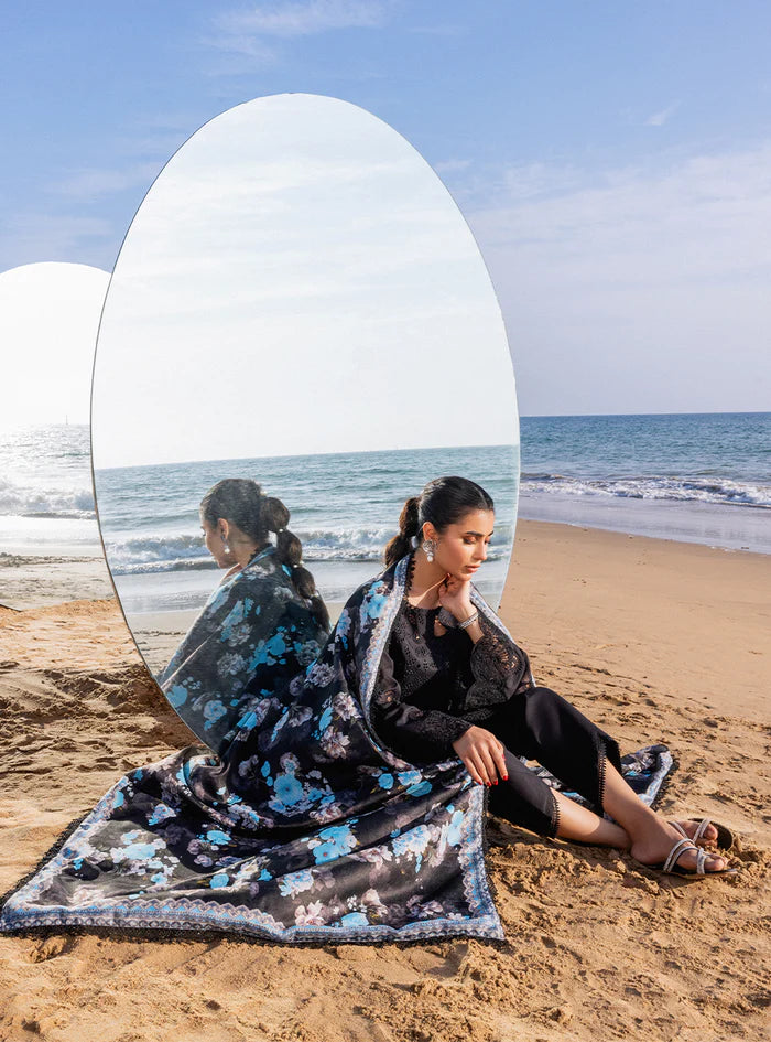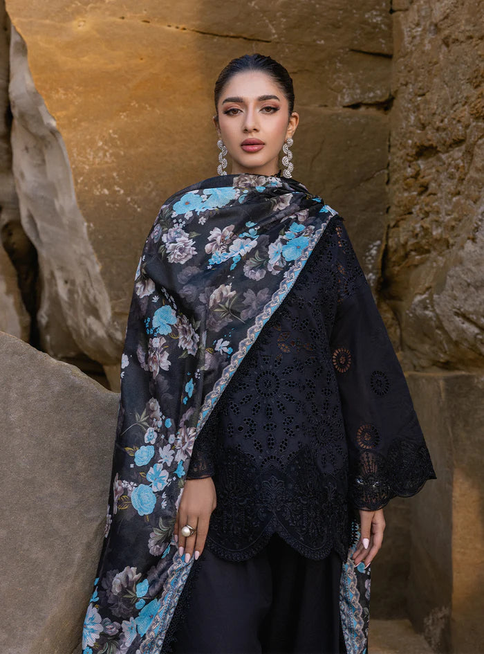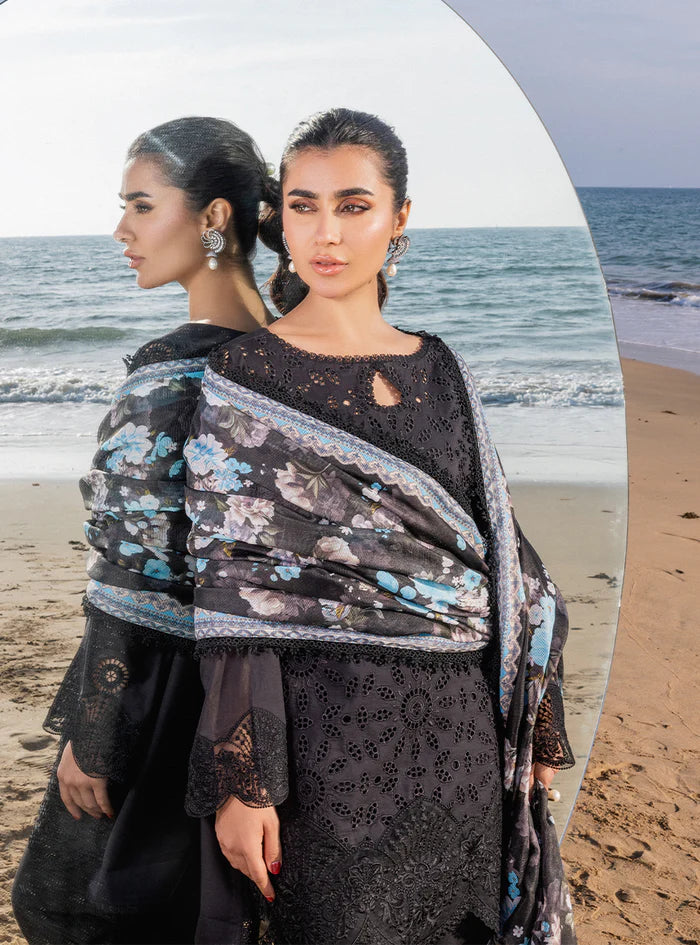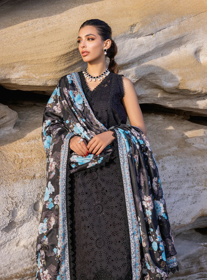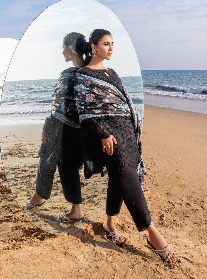 Black symbolizes sophistication, mystery, and refinement, making it a popular choice for traditional attire, particularly for evening or formal occasions. The embroidered border adds a touch of elegance and sophistication to the outfit, enhancing its overall visual appeal and providing a complete look on the black base. The set includes a net dupatta adorned with digital prints featuring soft pastel-colored floral designs.