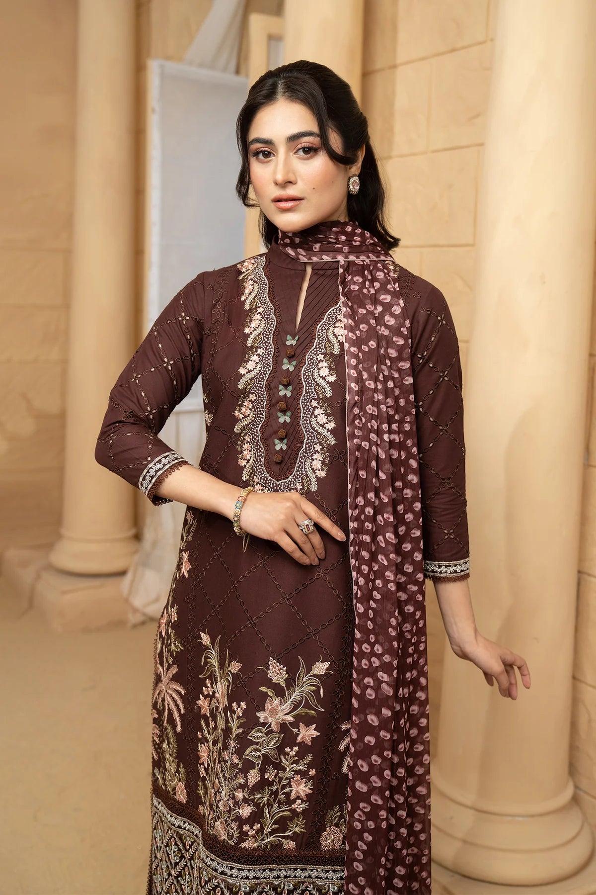 Elevate your wardrobe with our exquisite Mulberry Embroidered Unstitched Suit, featuring intricate detailing and paired with a classic plain trouser. Complete the look with a delicately printed chiffon dupatta, adding a touch of elegance to your ensemble.