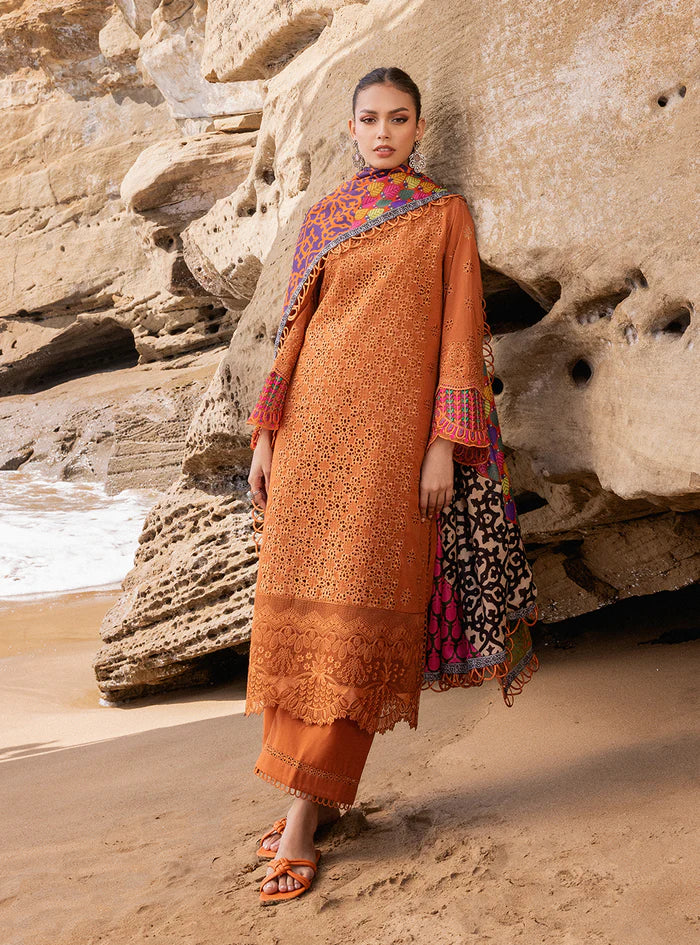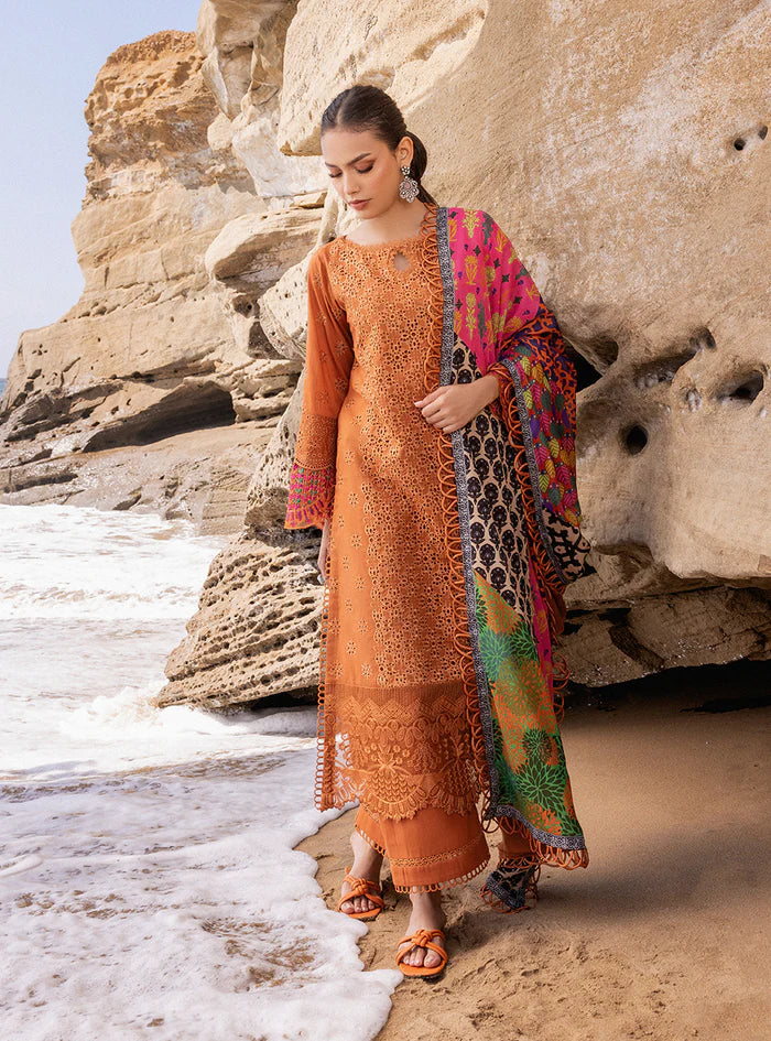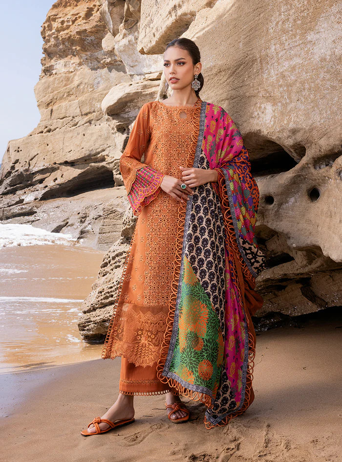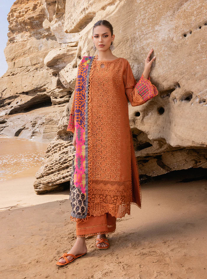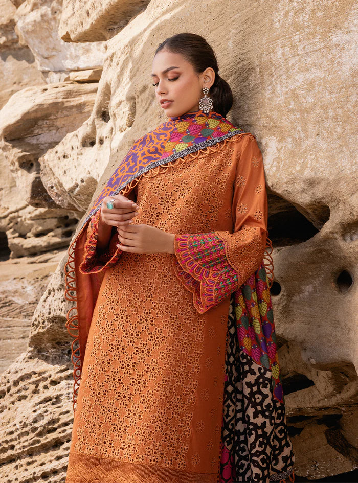 The base fabric is a rich rust-colored material, with overall chikan kari which adds warmth and depth to the ensemble. The sleeves and daaman of the outfit feature embroidered borders made from organza fabric. The set includes a net dupatta adorned with colorful digital prints, featuring vibrant and intricate designs such as florals, paisleys, or abstract patterns.