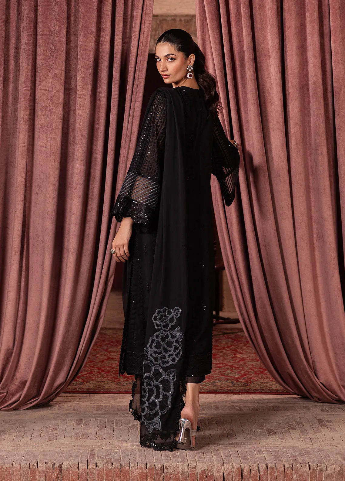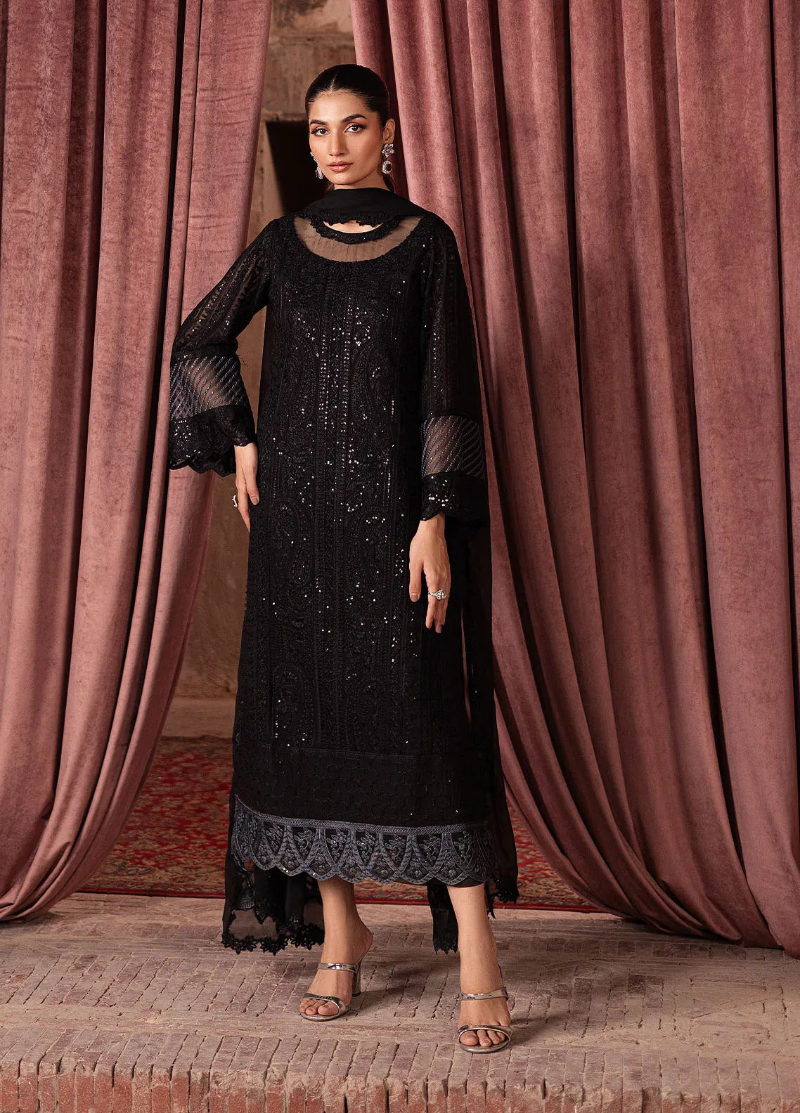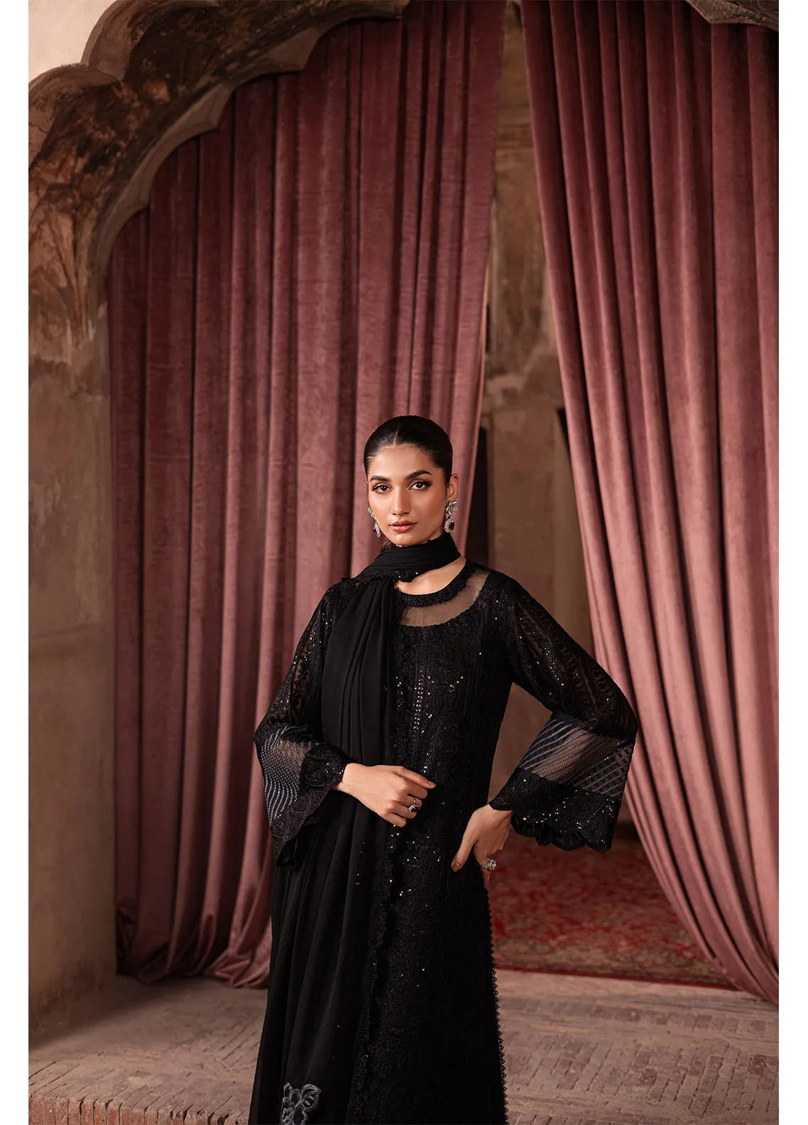 Introducing Noir Mystique – an enchanting black ensemble designed to captivate. Paired with a sequins embroidered chiffon dupatta and delicate organza bunches, this luxurious outfit offers a touch of mystery and timeless elegance, perfect for evening occasions