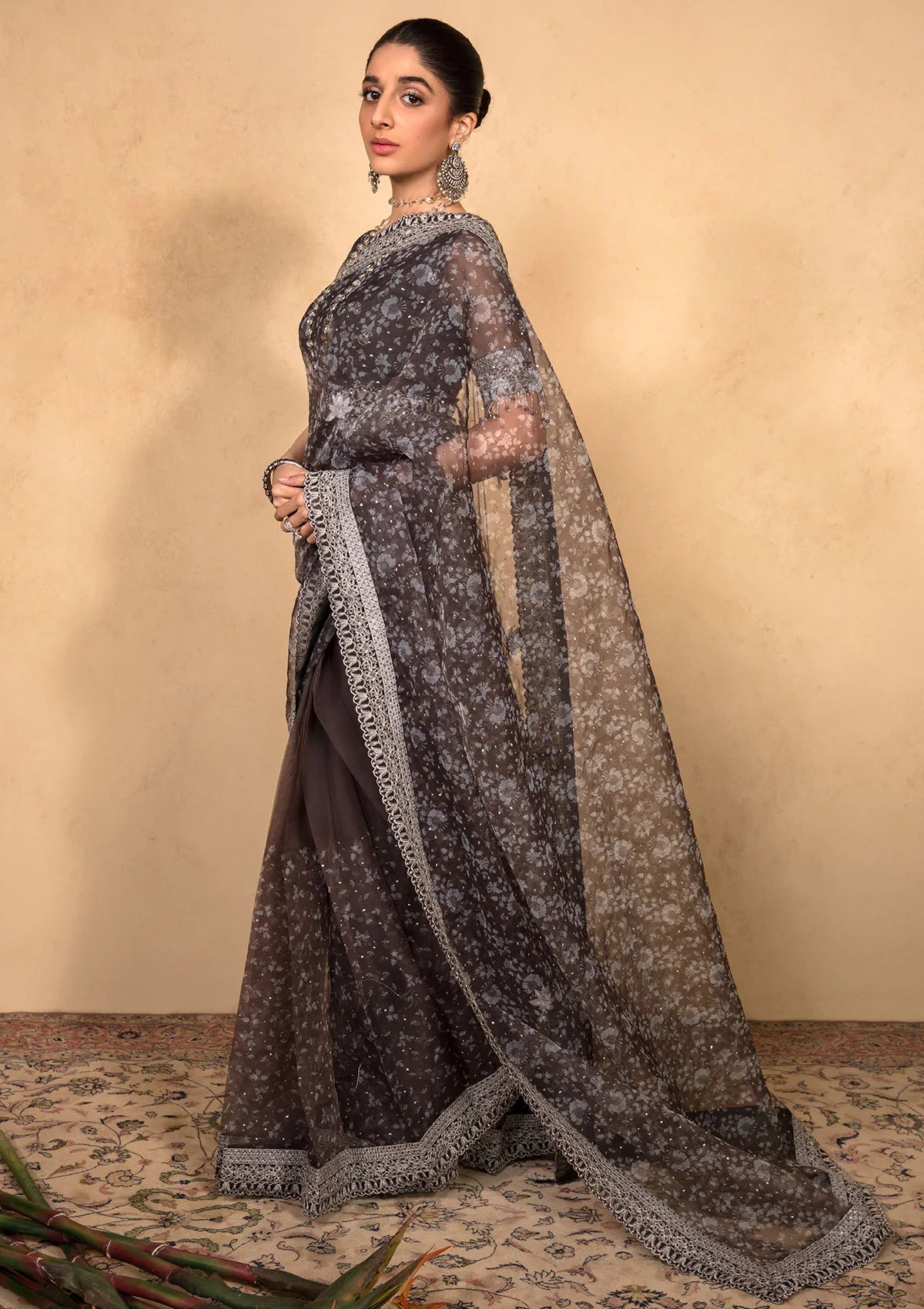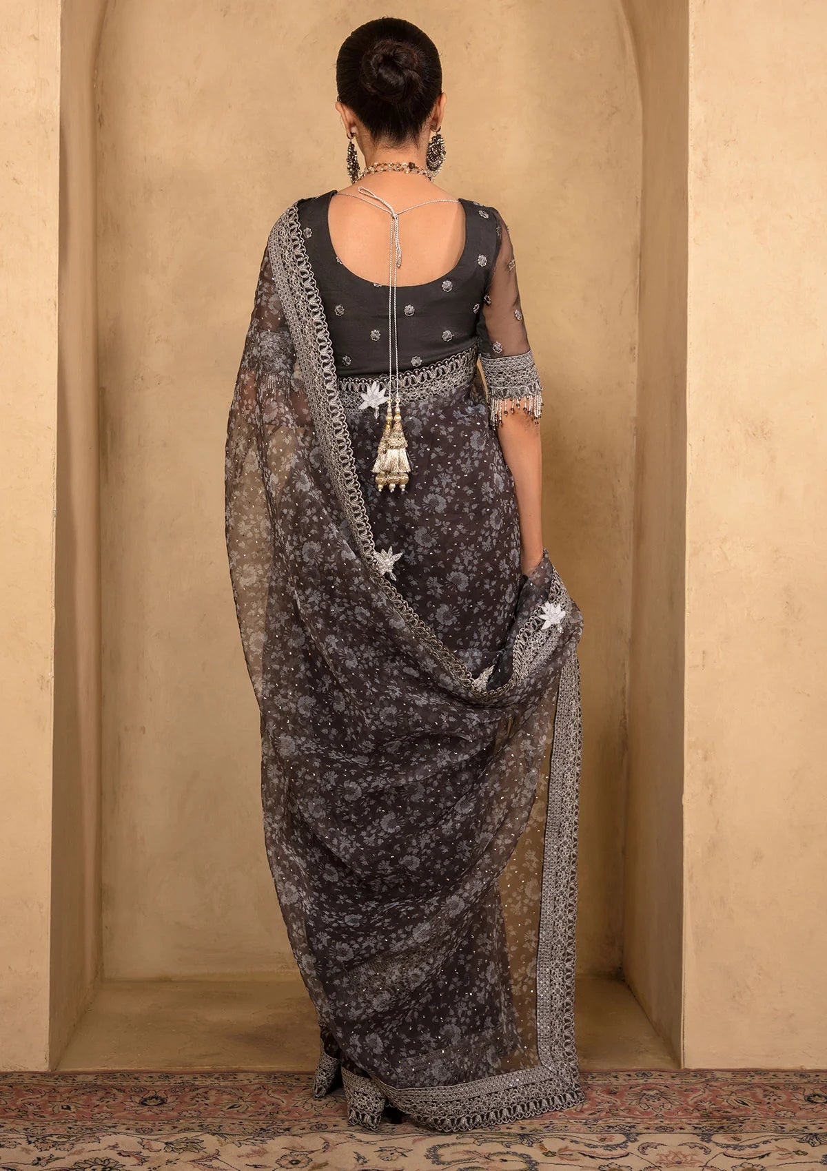 In an elegant ode to tradition, a beautifully crafted saree, rendered in charcoal grey, is intricately embellished with hand made mukesh. The saree is laced with a silver border highlighted with sequins and tilla. The flowing saree is paired with a heavily embroidered blouse with a  lushly encrusted border, this look is reminiscent of royal regalia and perfect choice for any formal occasion.