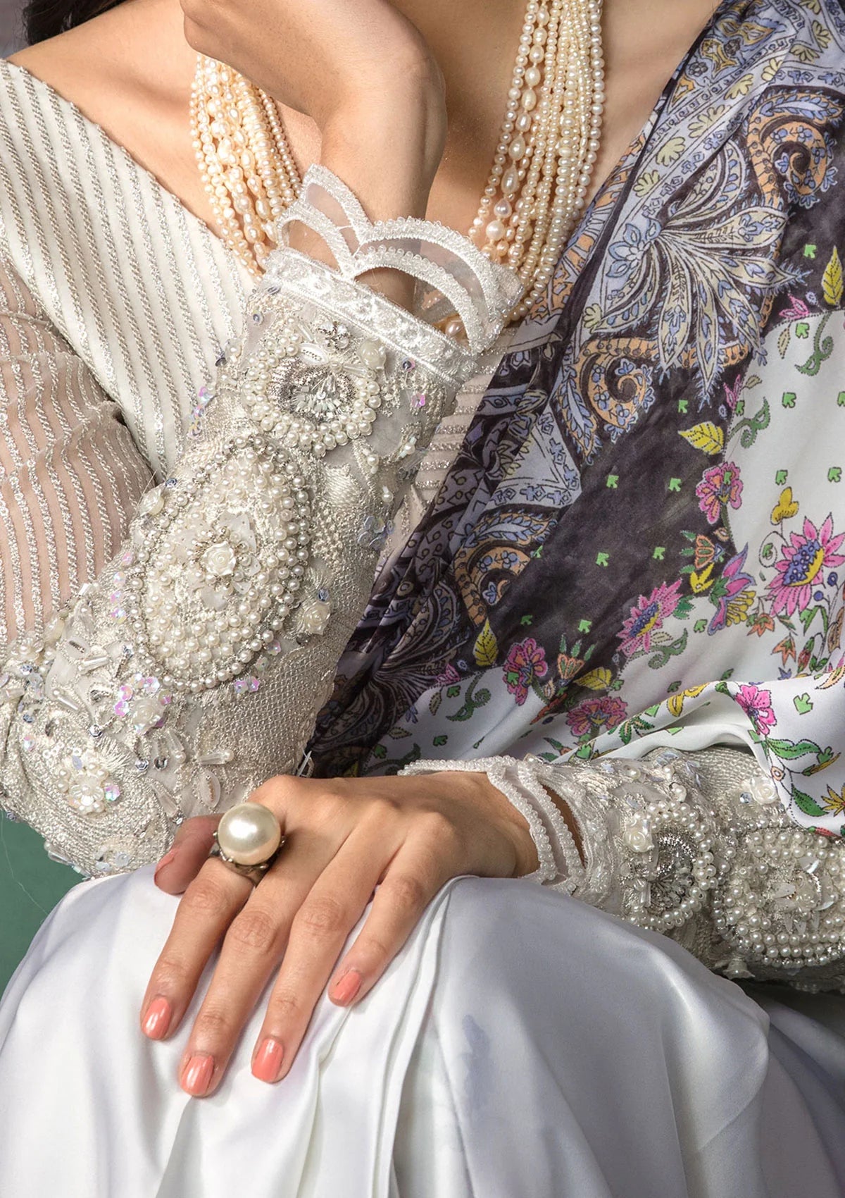 Luminous ornamental, paisley and floral print laid out in the shades of ivory and charcoal grey with tinges of moss and salmon pink to accentuate the overall composition. A printed charmeuse silk saree is effortlessly draped and paired with heavily embroidered blouse. The sleeves of the blouse is hand embroidered with matching sequins, crystals pearls and beads. The unique and versatile ensemble is perfect for the seasonal festive.