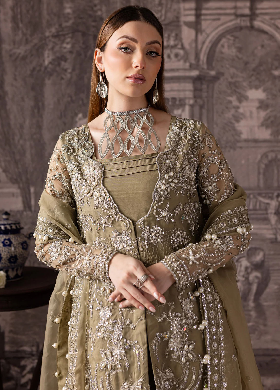 - Embroidered Neckline On Organza - 1PC