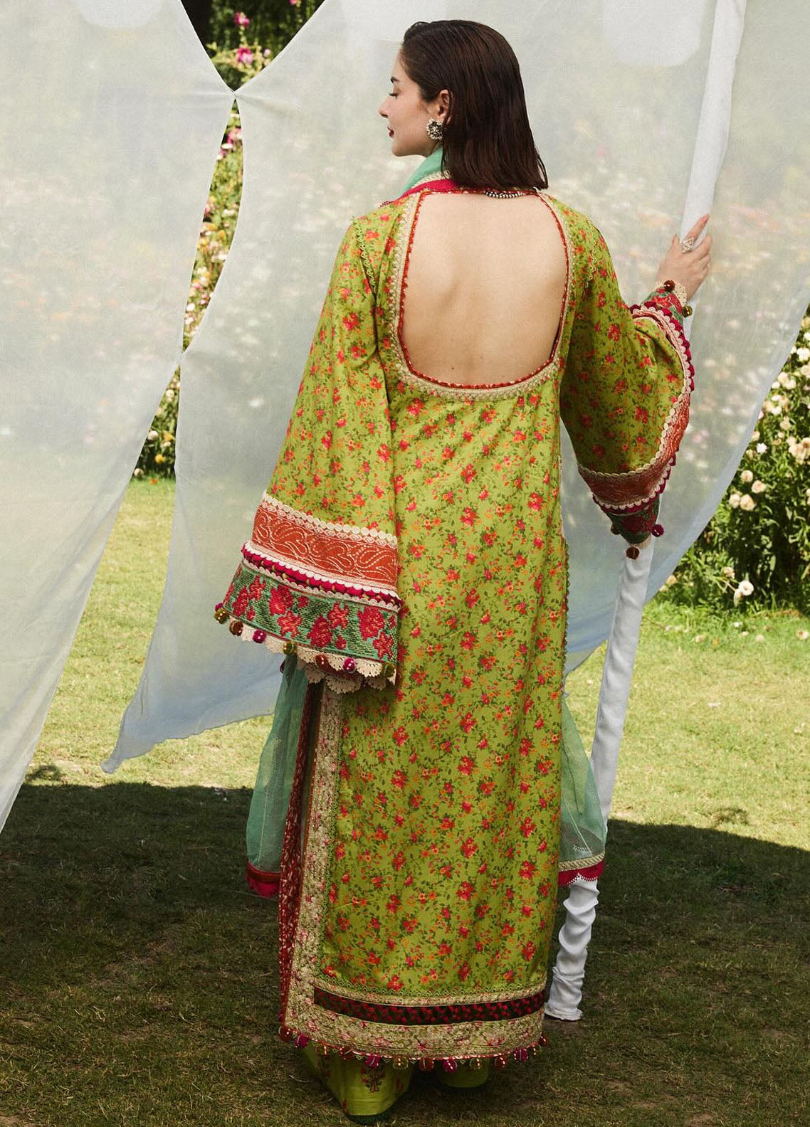 An elegant floral printed light greenshirt with embroidery all over. . The outfit also features printed color blocked borders for sleeves that enhnaces its visual appeal. It is paired with a stunning cotton net duppatta that perfectly complimetns the outfit.