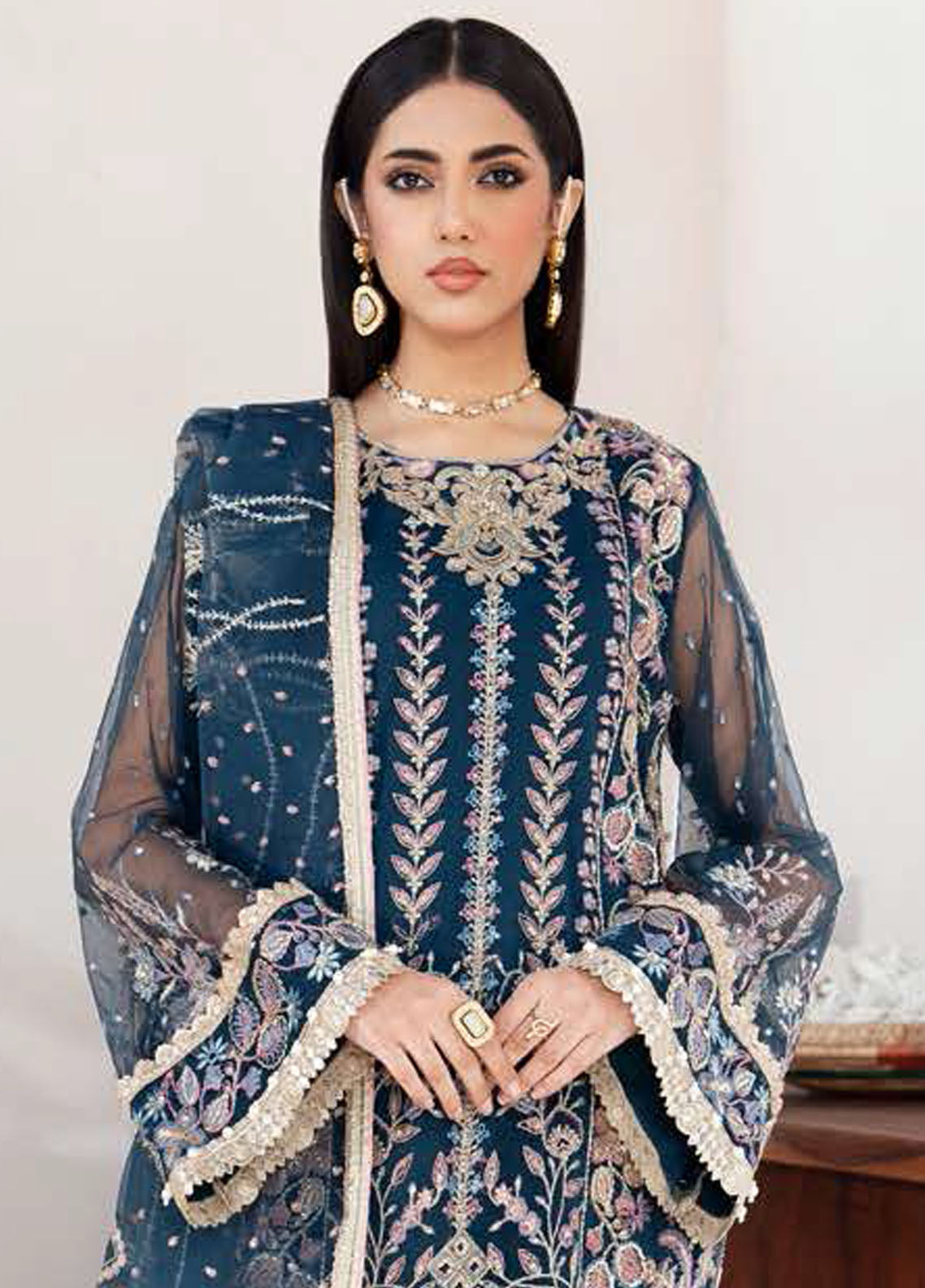 ‘Zaira’ showcases royalty with a deep blue hue tangoed with hints of subtle pink along with a lavish spill of silver-golden tilla and sequence work. Enriched with heavy embroidery, ‘Zaira’ is a straight-cut shirt paired with trendy flared pants. This art piece is crafted with with utmost attention to details with fine lacework done. It organza dupatta encompasses a unique pattern of embroidery that gives it a perfect blend of traditional and contemporary look.
