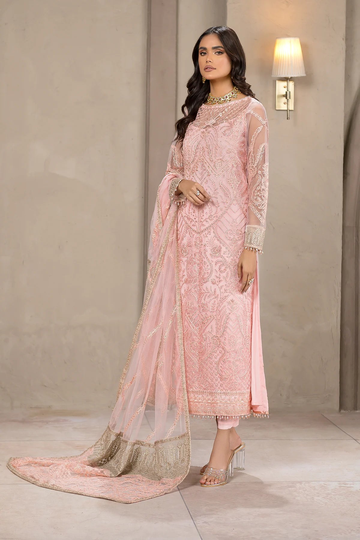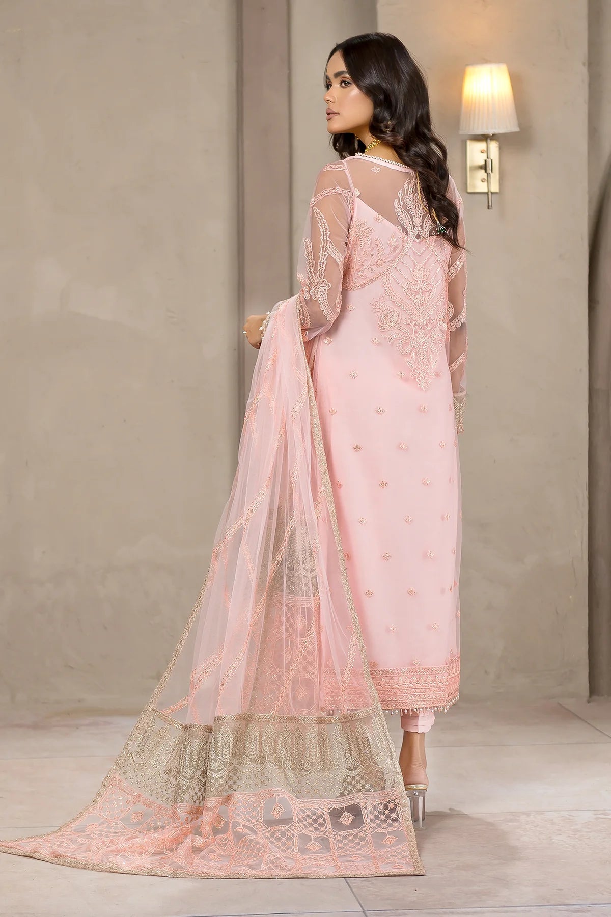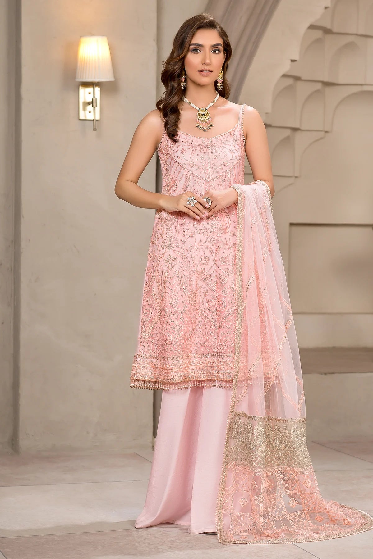 Beautifully crafted on a glamorous pink shade. Haven features classic patterns filled in threadwork and sequins. Paired with a tonal trouser, the look is complemented by a contrasting colored pallu dupatta which gives it a charm worth wearing this season.