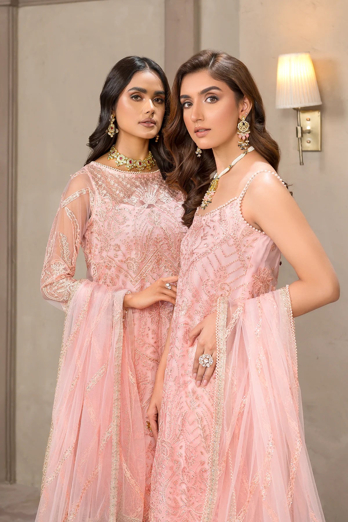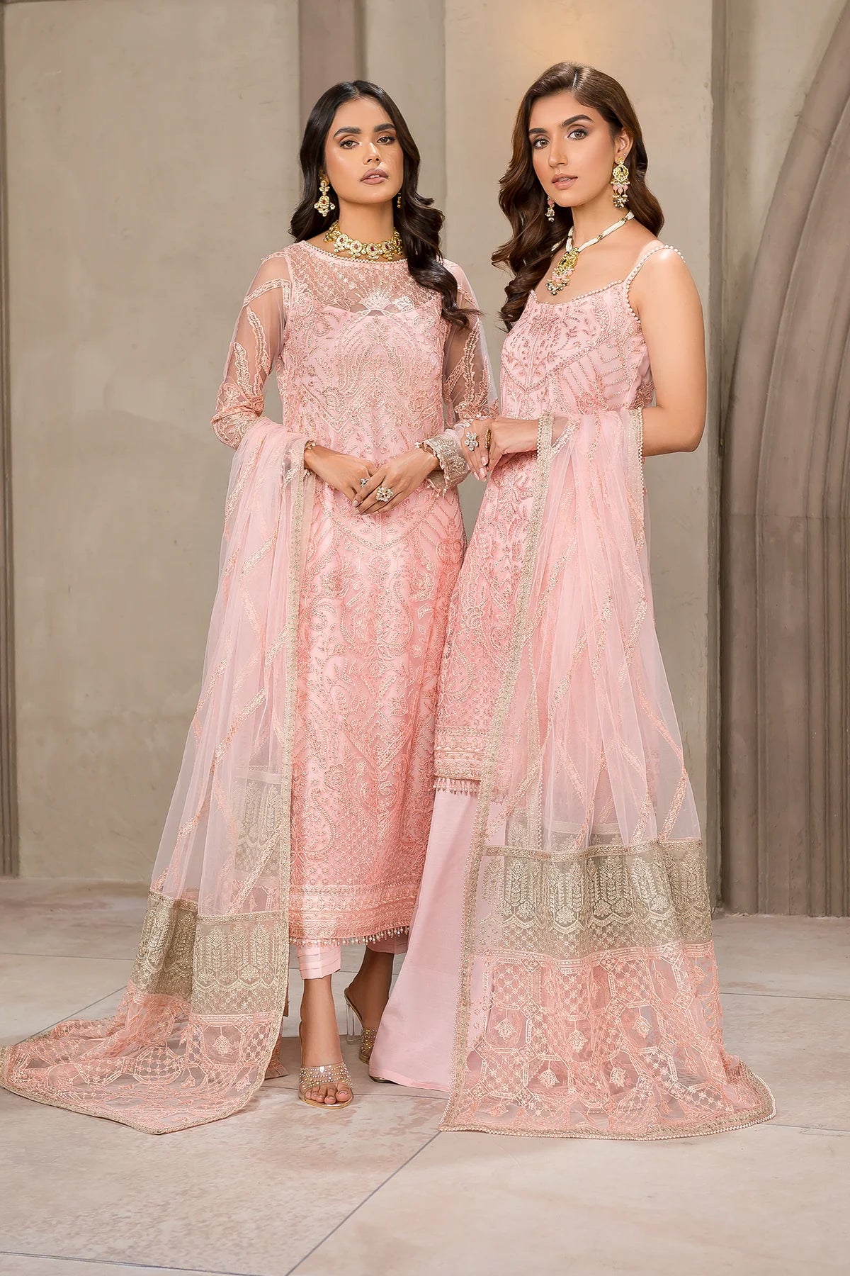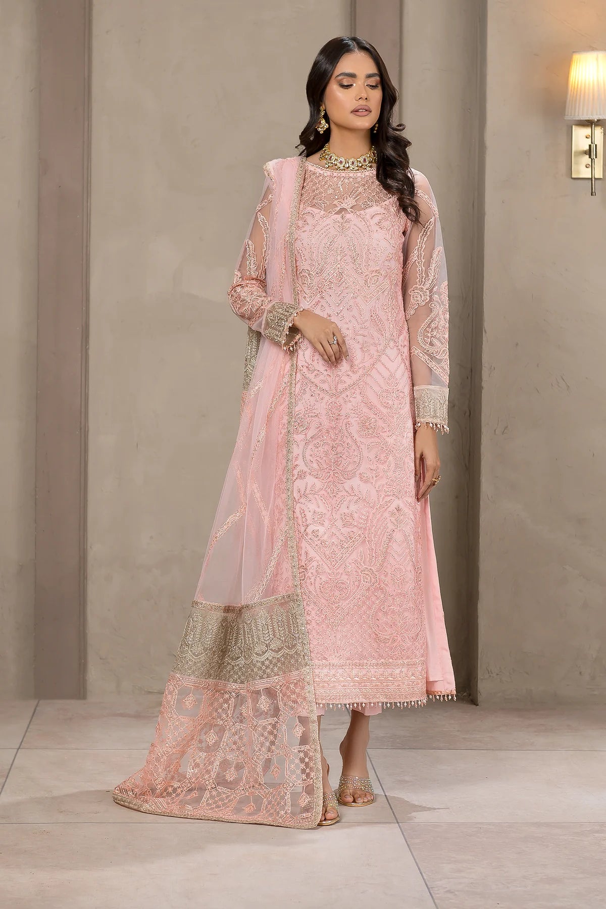 Beautifully crafted on a glamorous pink shade. Haven features classic patterns filled in threadwork and sequins. Paired with a tonal trouser, the look is complemented by a contrasting colored pallu dupatta which gives it a charm worth wearing this season.