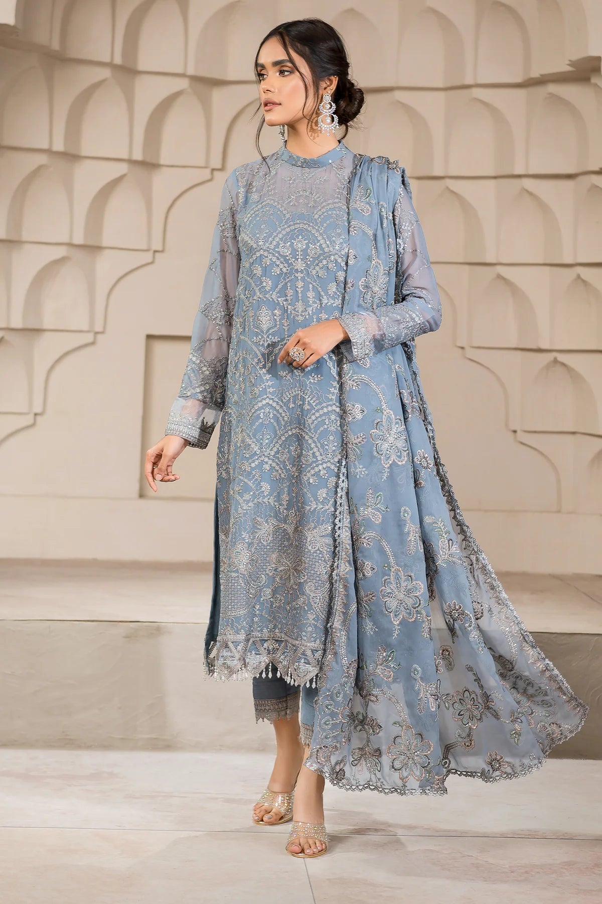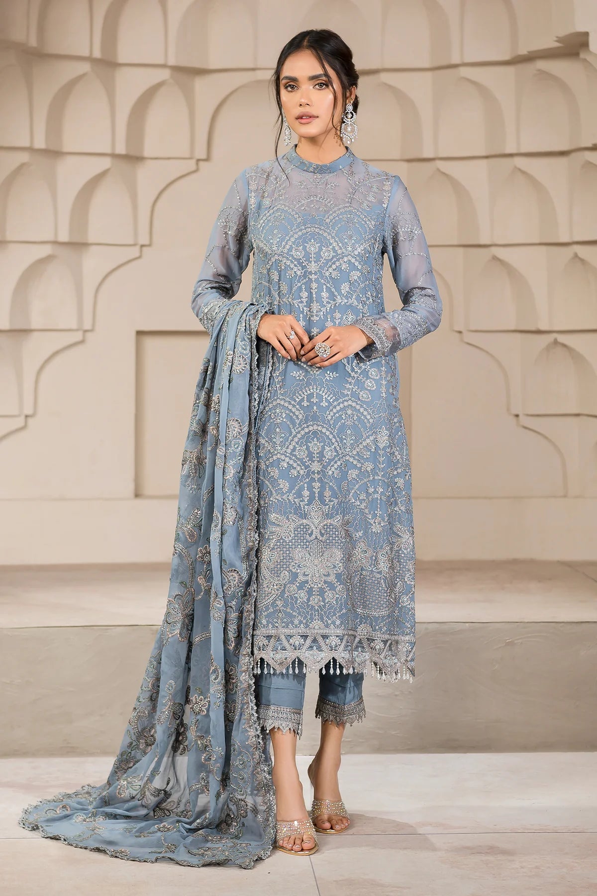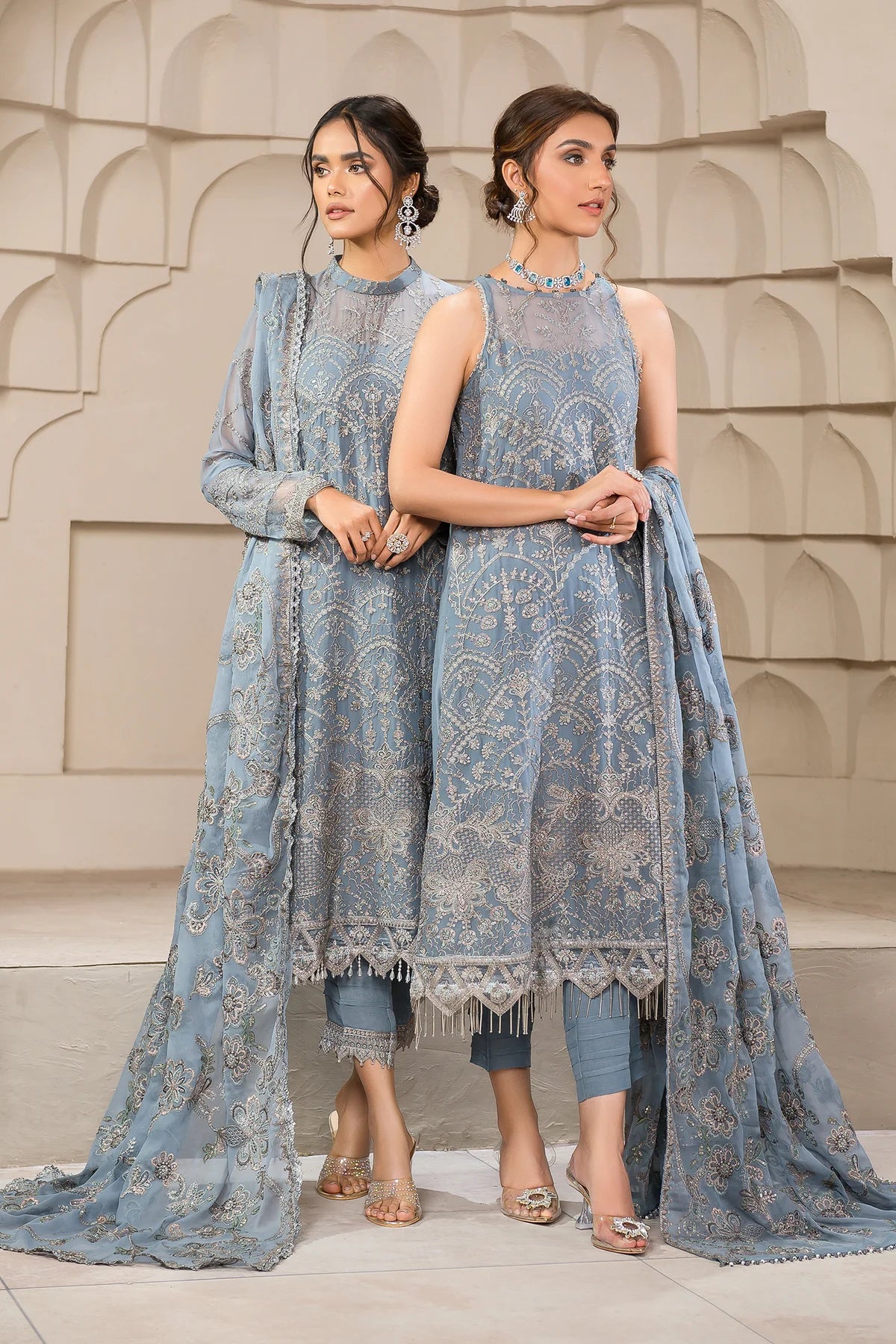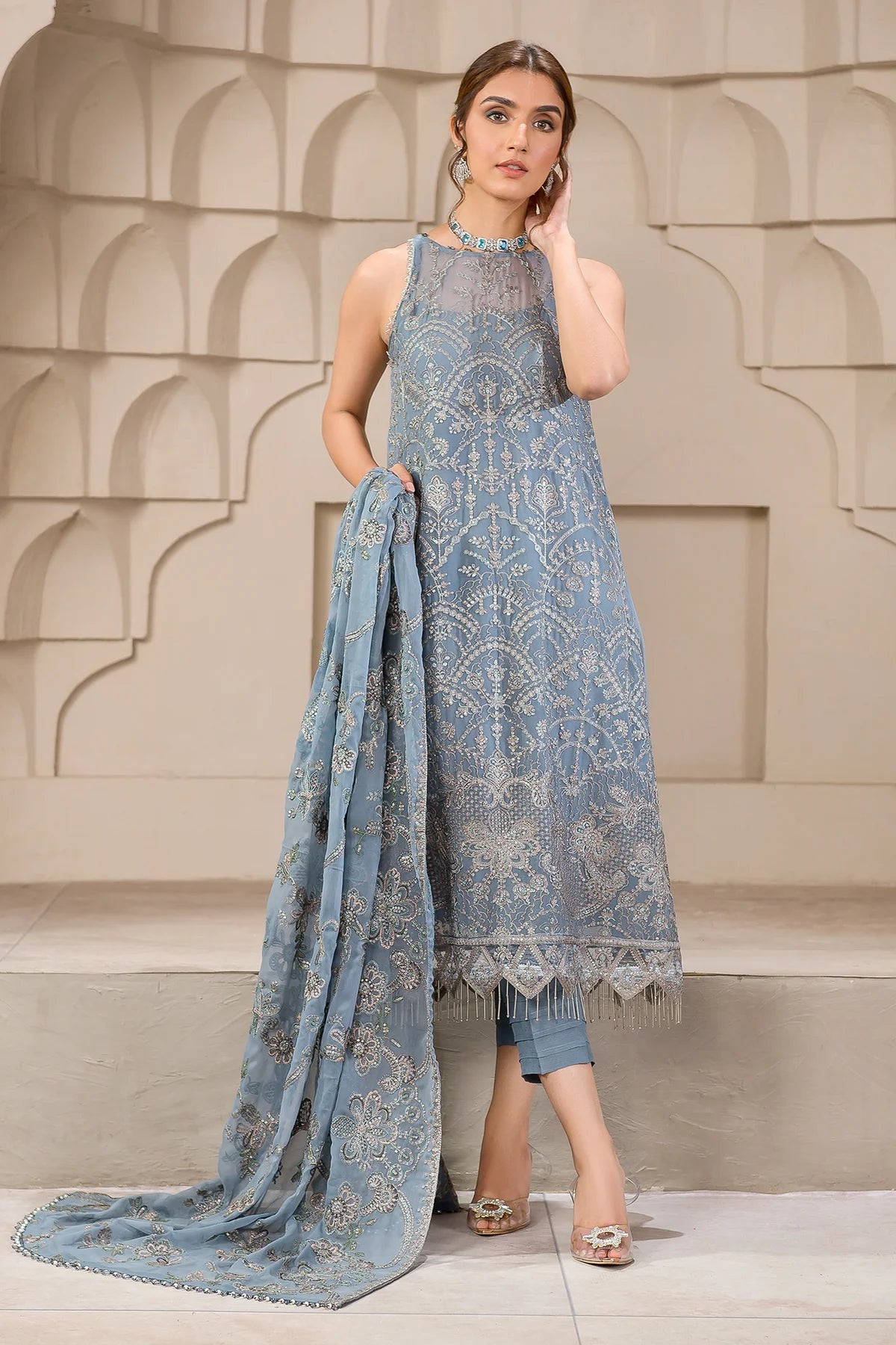Curated in a wonderful blue tone, blue bell embraces a perfection in its subtle embroidery and sequins work. Paired with a floral design dupatta and a tonal trouser this ensemble is a step towards slaying this season.