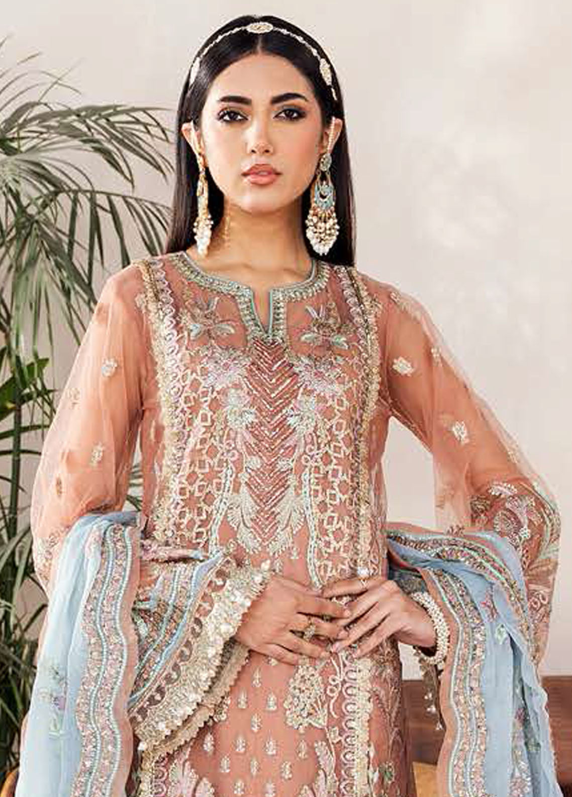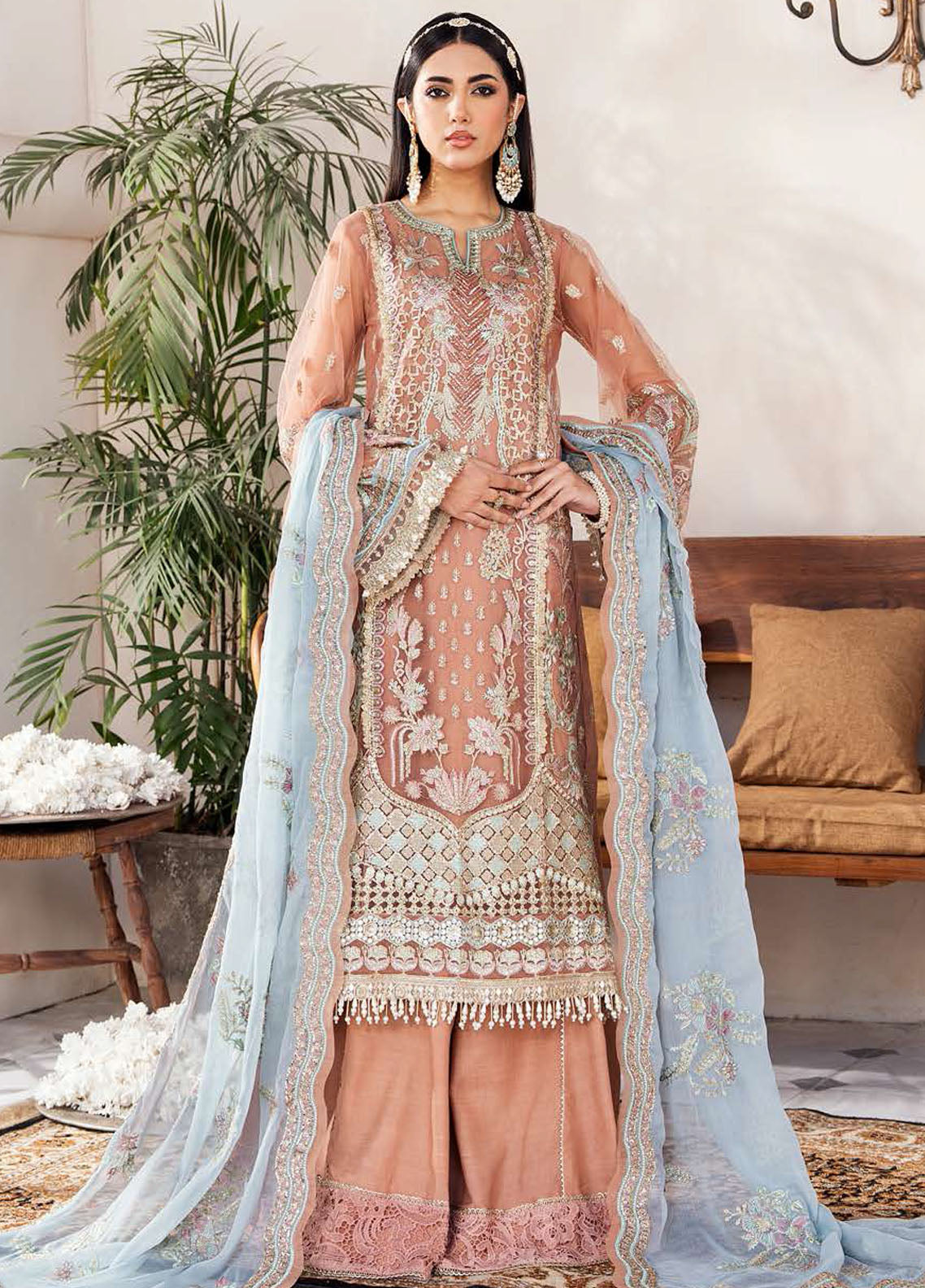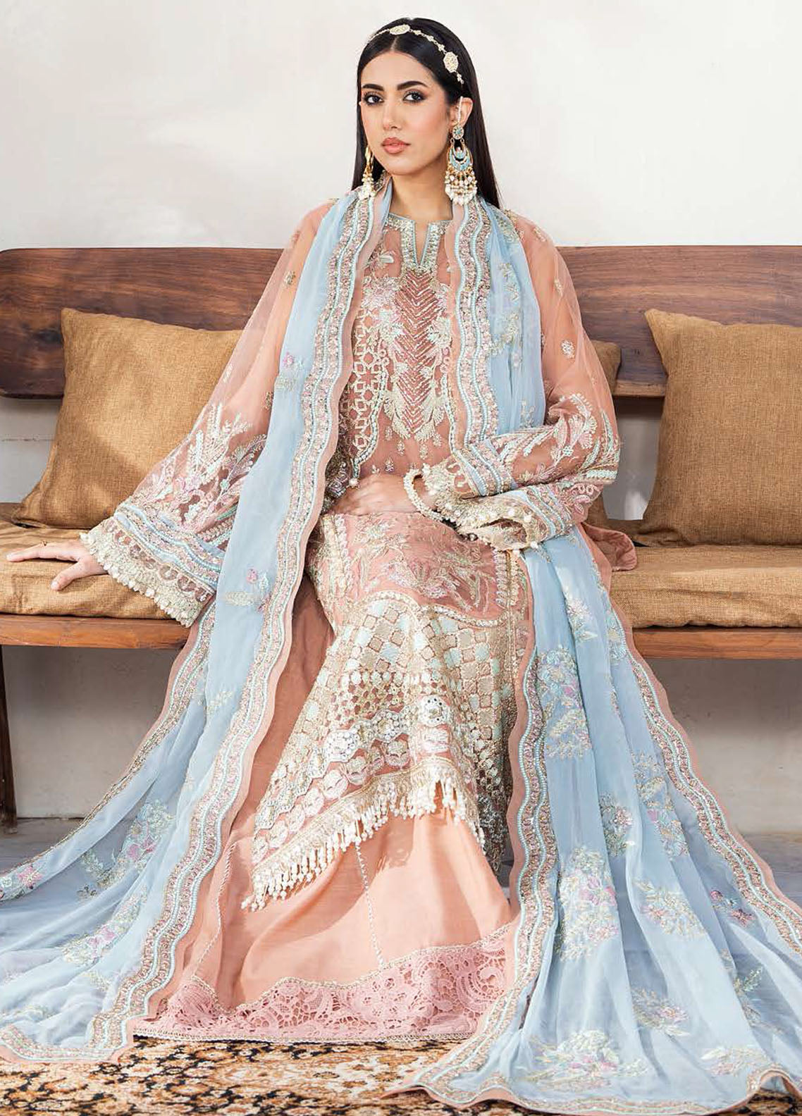 Immersed in a mesmerizing combination of peach and powder blue, ‘Hayaat’ brings life to a canvas of contemporary embroidered motifs, finished with graceful details of pearl work. The article reflects fine taste and elegance for its traditional cuts – a straight shirt and flared lehnga – along with chiffon duppata bedecked with luxurious thread, sequence and tilla work