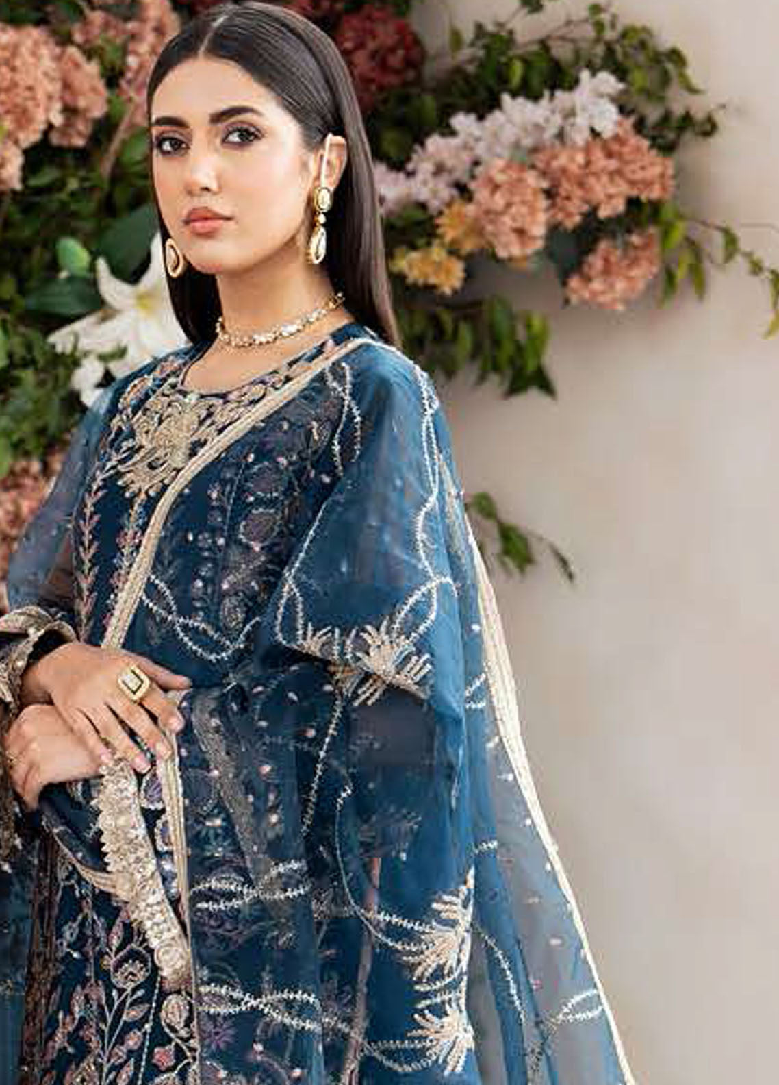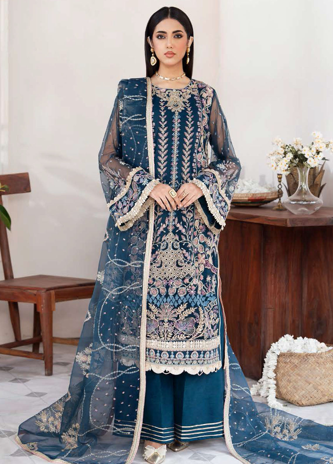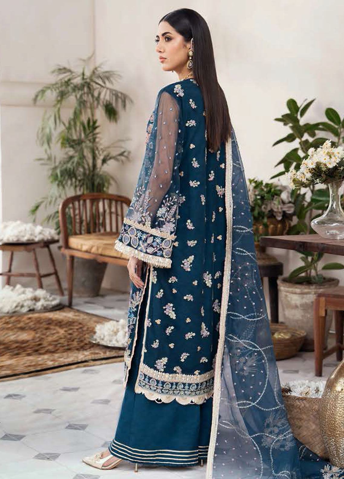 ‘Zaira’ showcases royalty with a deep blue hue tangoed with hints of subtle pink along with a lavish spill of silver-golden tilla and sequence work. Enriched with heavy embroidery, ‘Zaira’ is a straight-cut shirt paired with trendy flared pants. This art piece is crafted with with utmost attention to details with fine lacework done. It organza dupatta encompasses a unique pattern of embroidery that gives it a perfect blend of traditional and contemporary look.