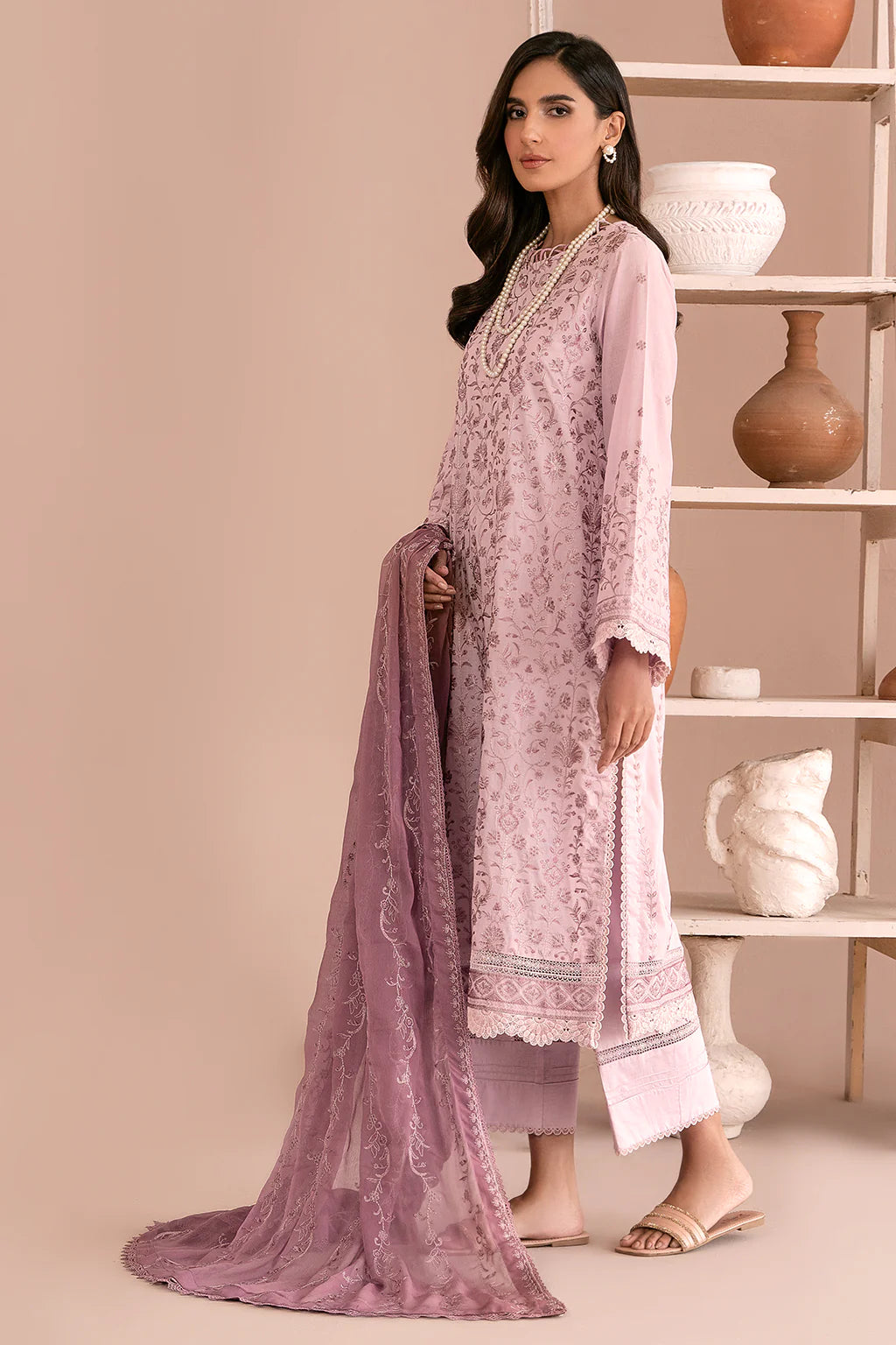 Minimalistic and artful composition is crafted onto this beautiful fabric. This ensemble is a subtle design featuring contrast threadwork.. Paired with an embroidered dupatta and tonal trouser this look is a must to your formal wardrobe.