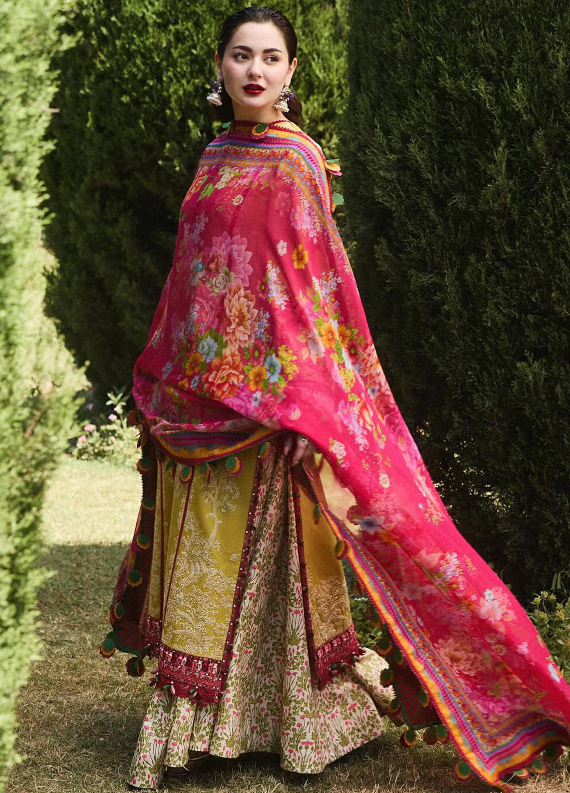 A fresh,summery lime yellow ensemble adorned with intricate white embroidery,featuring a pink panel on the shirt,paired with printed trousers and a pink digital printed chiffon dupatta.